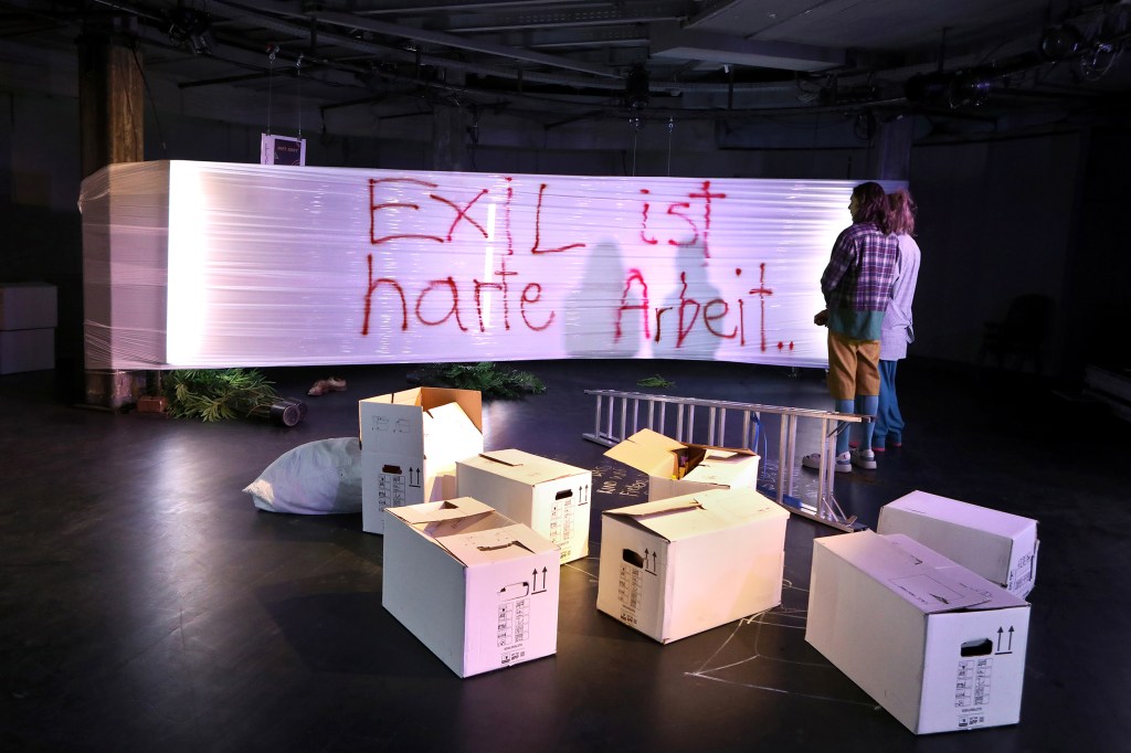 „Nach erfolglosen Versuchen, einen Maulbeerbaumschößling in den Beton des Bühnenraums zu pfanzen, wird Risto Kübar mit halbtransparenter Plastikfolie in einen abgegrenzten Bereich eingeschlossen. «Lass mich doch hier zu Hause sein», ist der Wunsch. Integration fndet nicht statt, nur Ausgrenzung. Die dennoch nicht resignative Schlussfolgerung wird auf die Folie gesprüht: «Exil ist harte Arbeit.» Für diese Bochumer Inszenierung hat sie sich gelohnt.“